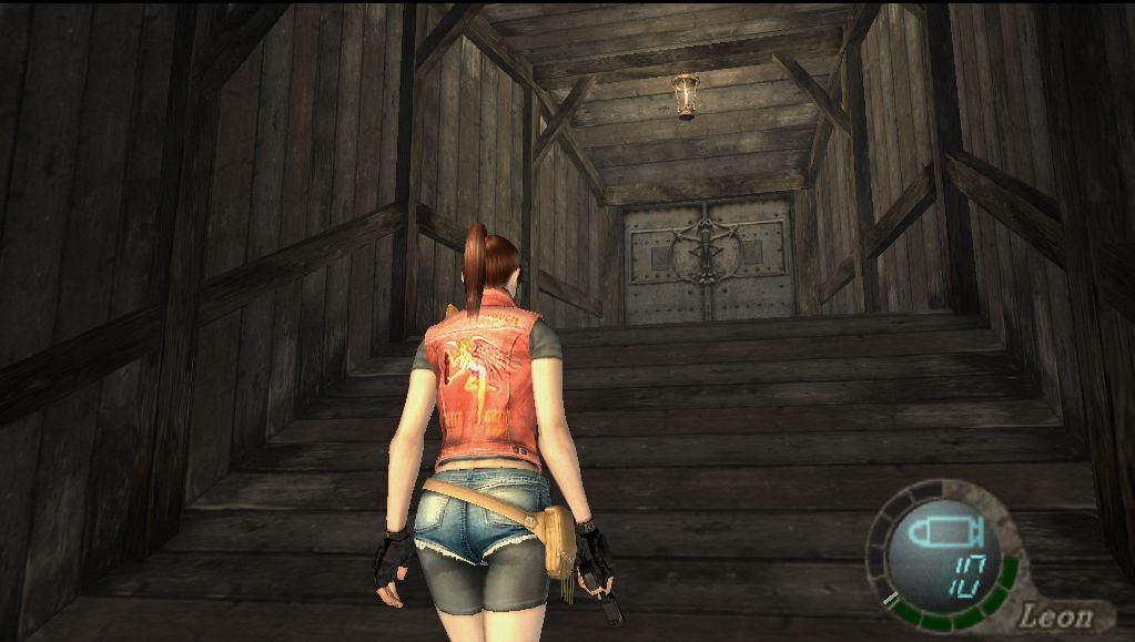 "This is Claire Redfield in Resident Evil 4 (RE4) for PC. Via a particular mod you can download, Claire's RE: Darkside Chronicles model (Code Veronica jeans or RE2 hotpants) replaces Leon's in-game model. Humorously, all else remains, including his voice, in-game voice effects, and his name on the HUD. This at least gives "Leon" a hot makeover. Screenshots taken using FRAPS."